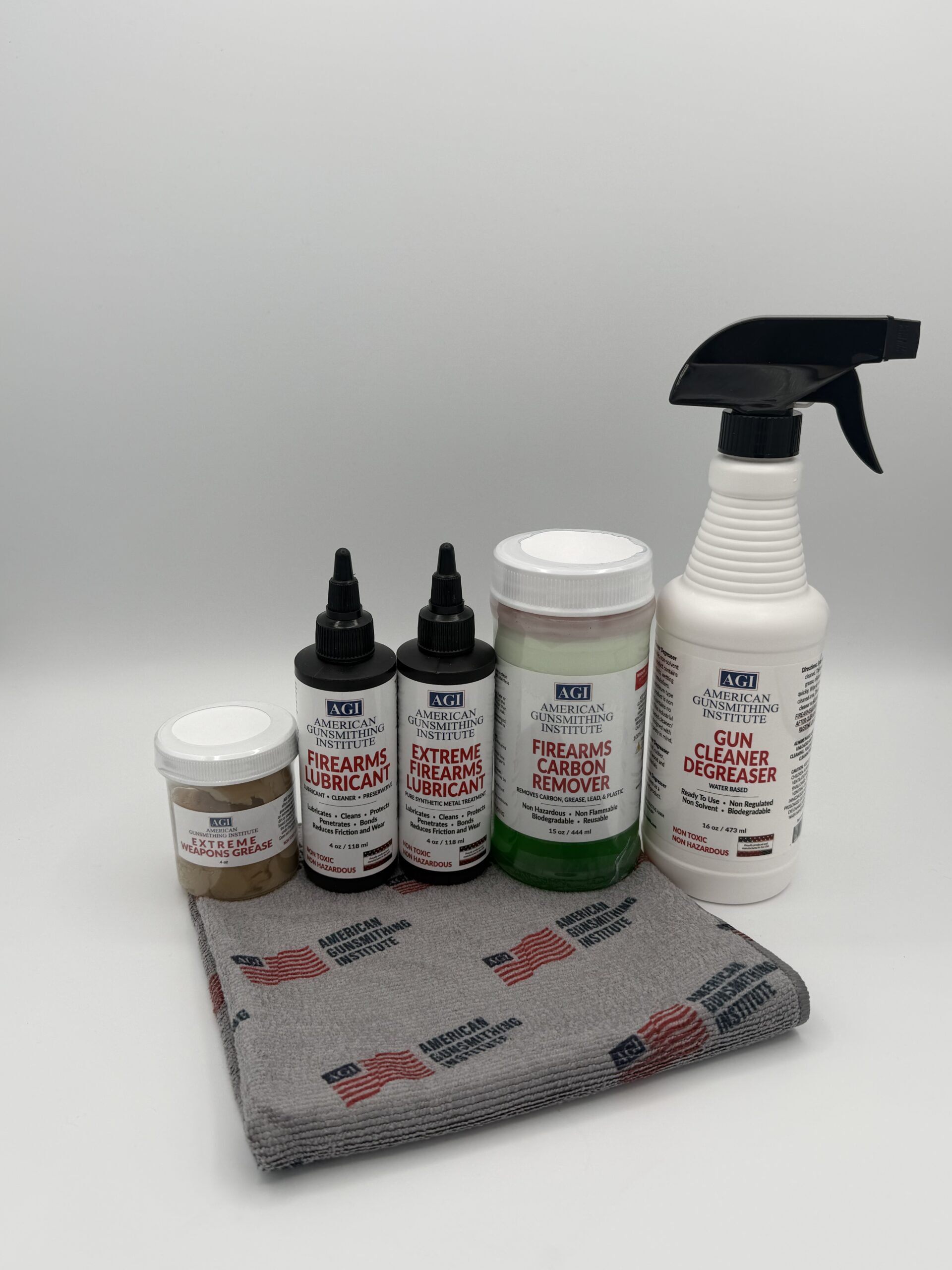 The AGI Firearms Lubricant and Cleaner Bundle contains 5 non-toxic, non-hazardous, firearms cleaning and lubrication products for firearms maintenance all made in the USA. The package contains 2 4oz bottles of Specially Formulated Firearms Lubricants, 15oz bottle of Carbon Remover, 4 oz of Extreme Weapons Grease, and a 16oz Spray Bottle of Gun Cleaner & Degreaser. Plus an AGI 16 inch x 16 inch Microfiber Cloth – Perfect for cleaning with the non-marring soft microfiber surface this cloth is ultra absorbent and washable.